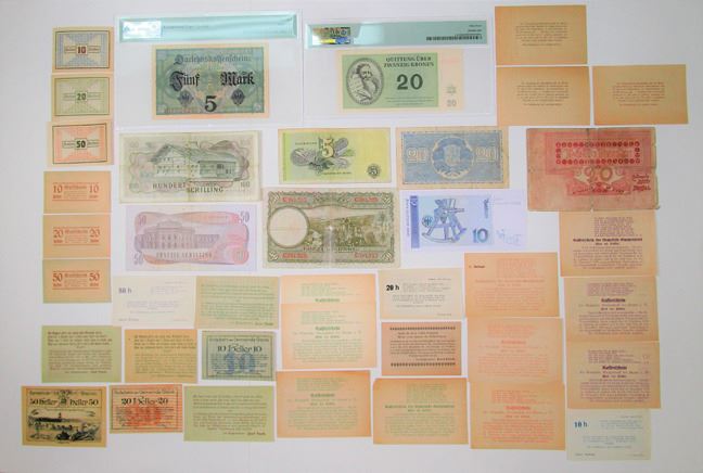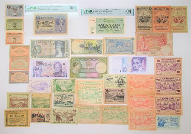 Austria, Belgium, Luxembourg, Finland, Germany, & Czechoslovakia, 1912-1991. Assortment of Issued Banknotes including 2 PMG graded notes, Includes: Austrian Notgeld, 10-20-50 Heller, Gosau Gars Geiergsberg etc. (30 pcs); Austrian National Bank, 50 Schilling, P-143a & 100 Schilling P-145a; Belgium National Bank, 20 Francs, P-67; Finlands Bank, 20 Markkaa, P-78a; Luxembourg Allied Occupation, 50 Francs, P-46a; Czechoslovakia, Theresienstadt Ghetto, 20 Kronen, CZ-654, PMG CH UNC 64; Germany State Loan, 5 Mark, P-56b, Issued Note, PMG CH AU 58 EPQ; Germany Allied Occupation Post WWII, 5 DM, P-13a; Deutsche Bundesbank, 10 Deutsche Mark, P-38b. Notes are Fine-AU condition. (39). Sold "AS IS" no returns accepted.