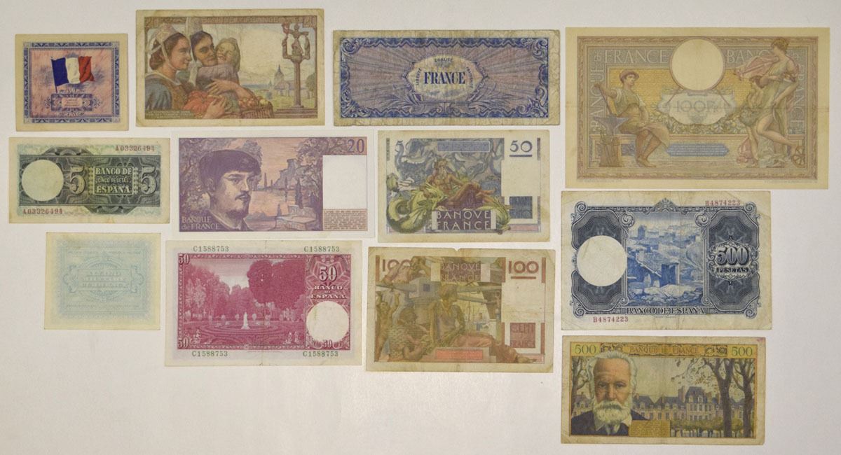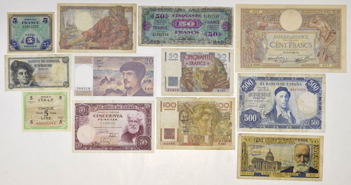 Europe, 1939-83. Lot of 12 Issued Banknotes, Includes: Banque de France, 1939, 100 Francs, P-86b; 1949, 20 Francs, P-100c; Allied Military Currency, 1944, 5 Francs, P-115a; 1944, 50 Francs, P-117a; Banque de France, 1950, 50 Francs, P-127b; 1953, 100 Francs, P-128e; 1954, 500 Francs, P-133a; 1983, 20 Francs, P-151d; Allied Military Currency - Italy, 1943, 5 Lire, P-M12; Banco de Espana, 1948, 5 Pesetas, P-136a; 1951 (1956), 50 Pesetas, P-141a; 1954 (1958), 500 Pesetas, P-148a. Notes range from Fine to VF+ condition. (12). Sold "AS IS" no returns accepted.