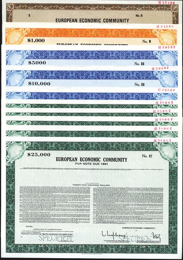 Lot of 10 bonds, Includes 3 different issues with various denominations and interest rates from $-Odd to $25,000, all with Pin-Punch Specimen and dated, All with no vignettes, Rare Pre EU bonds. VF-XF, SCBNC. The European Economic Community (EEC) was a regional organization which aimed to bring about economic integration between its member states. It was created by the Treaty of Rome of 1957. Upon the formation of the European Union (EU) in 1993, the EEC was incorporated and renamed as the European Community (EC). In 2009 the EC's institutions were absorbed into the EU's wider framework and the community ceased to exist.