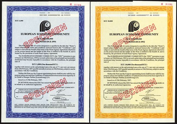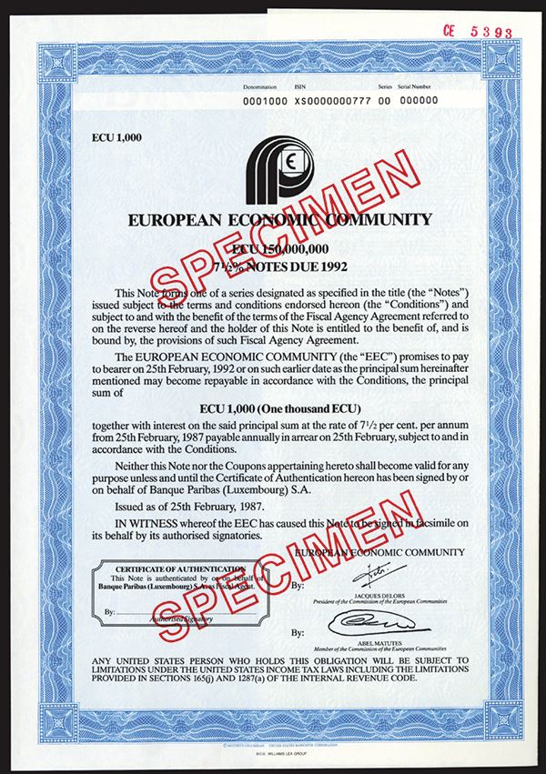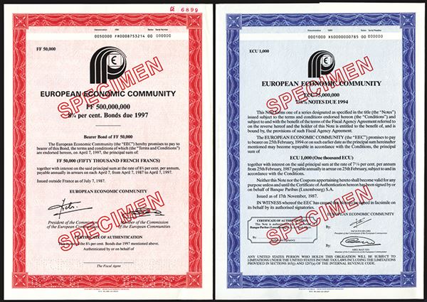Lot of 5 bonds, All with Logo on top, some with coupons, various denominations and percentages, Rare Pre EU bonds. VF-XF, SCBNC. The European Economic Community (EEC) was a regional organization which aimed to bring about economic integration between its member states. It was created by the Treaty of Rome of 1957. Upon the formation of the European Union (EU) in 1993, the EEC was incorporated and renamed as the European Community (EC). In 2009 the EC's institutions were absorbed into the EU's wider framework and the community ceased to exist.