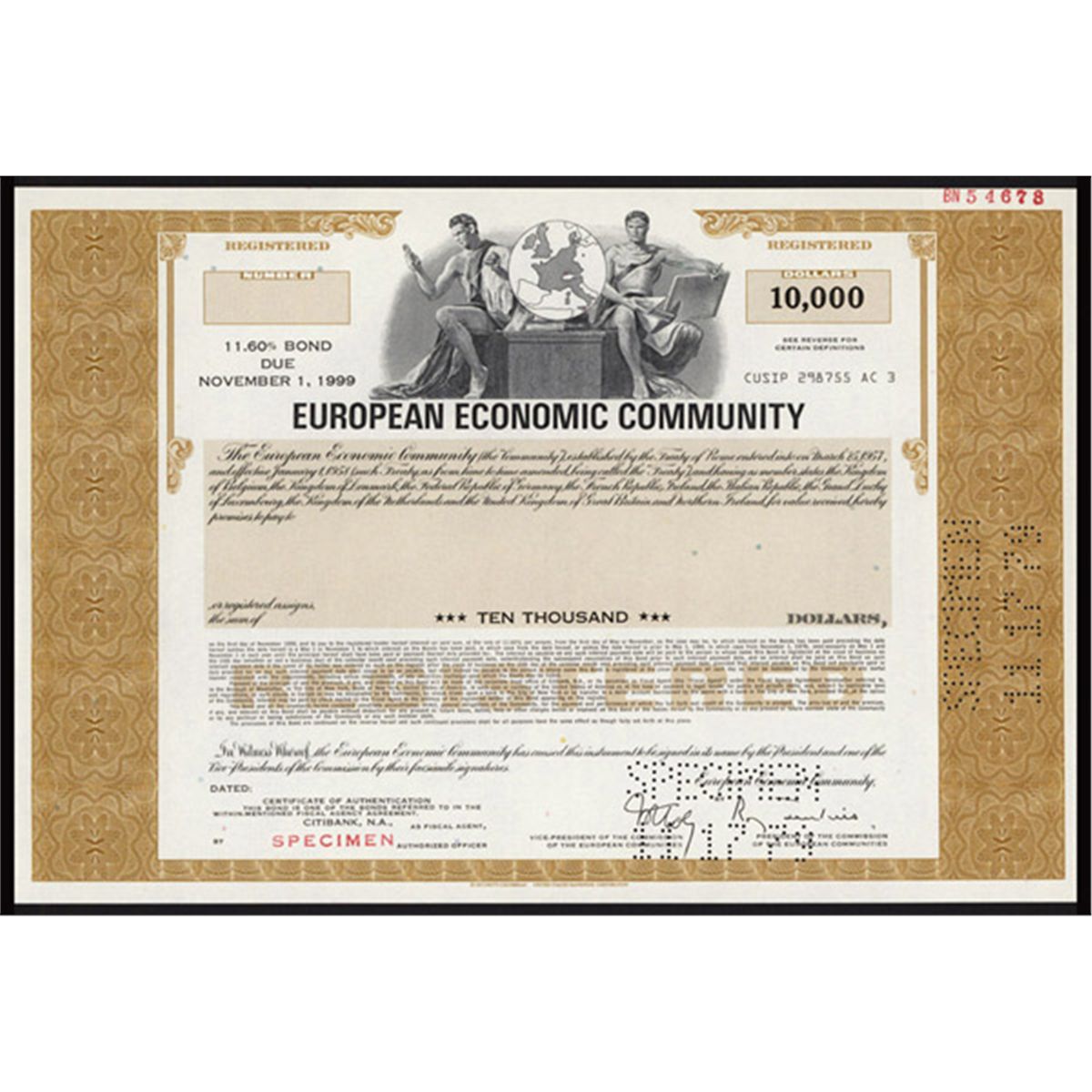 Registered 11.6 % Note Due November 1st, 1999, $10,000, Specimen bond, Men flank globe, Brown, Pin cancels, XF.