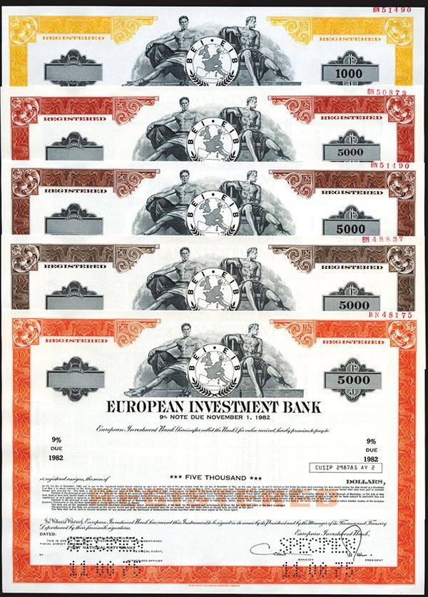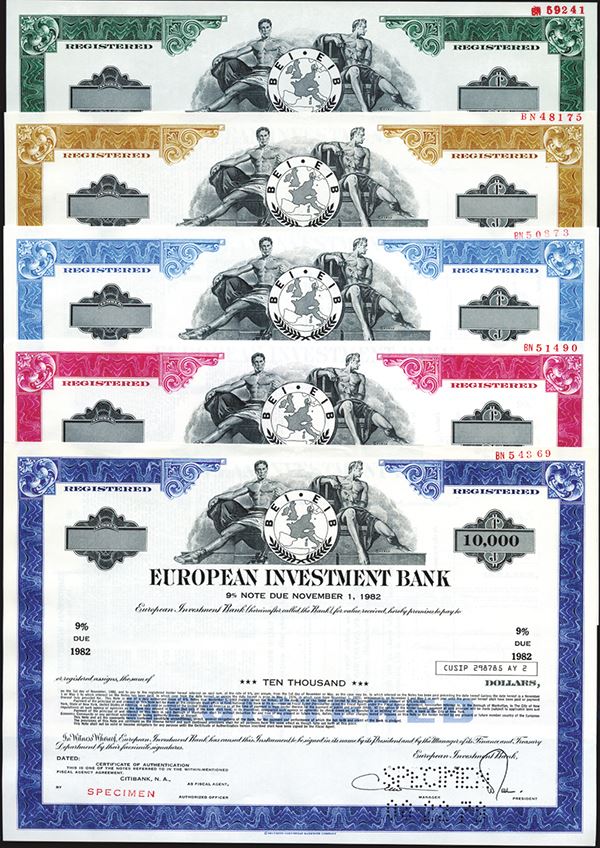 Lot of 11 bonds, All with Logo flanked by allegorical men on top, All are Registered Bonds of various denominations and percentages, Rare Pre EU bonds. VF-XF, SCBNC. The European Investment Bank (EIB) is the European Union's nonprofit long-term lending institution established in 1958 under the Treaty of Rome. As a "policy-driven bank" whose shareholders are the member states of the EU, the EIB uses its financing operations to bring about European integration and social cohesion. It should not be confused with the European Central Bank. The EIB is a publicly owned international financial institution and its shareholders are the EU member states. Thus the member states set the bank's broad policy goals and oversee the two independent decision-making bodies—the board of governors and the board of directors. It is the world's largest international public lending institution