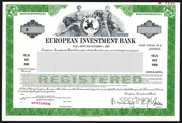 $-odd, specimen 10 1/8% Registered Bond Due 2000. Black on green border. Allegorical men flank bank logo. XF condition. SCBNC.