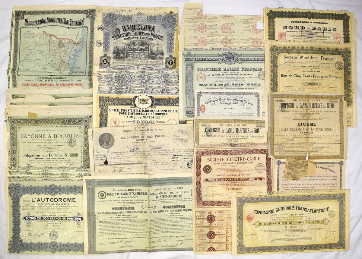 France & Spain, ca.1900s. Lot of over 30 foreign bond and share certificates, bonds, and financial instruments representing transportation, utilities, industrial, agricultural, maritime, and infrastructure enterprises. The group includes bearer bonds and shares, coupon bonds with attached or partially removed coupons, and illustrated certificates featuring ornate borders, allegorical vignettes, maps, industrial scenes, and company buildings. Issuers reflect a range of sectors such as railways, canals, electric power, shipping, steel, cable, and agricultural development. Documents show period typography, revenue stamps, serial numbers, and handwritten signatures. Conditions range from VG to Very Fine condition, with folds, toning, edge wear, cancellations, and coupon removal consistent with age and use. (30+). Sold “AS IS” no returns accepted.