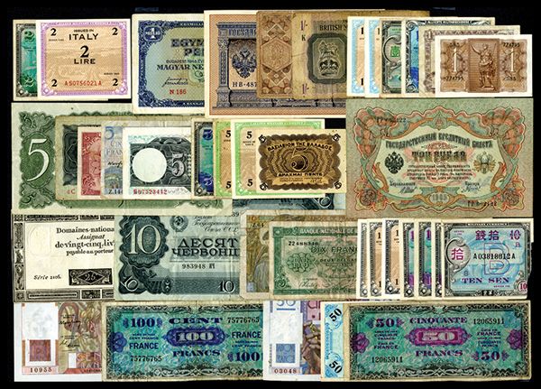 European and Africa Banknote Assortment. Lot of 75+ notes, Highlights include a small group of Ferman Notgeld and inflation currency; a small Russian assortment including an 1898 1 Ruble State Note in XF-AU and a 1934 5 Gold Rubles in Fine; a Belgium Short Snorter; France 1948, 50 Francs and 100 Francs, XF-AU and numerous other notes. Please inspect.
