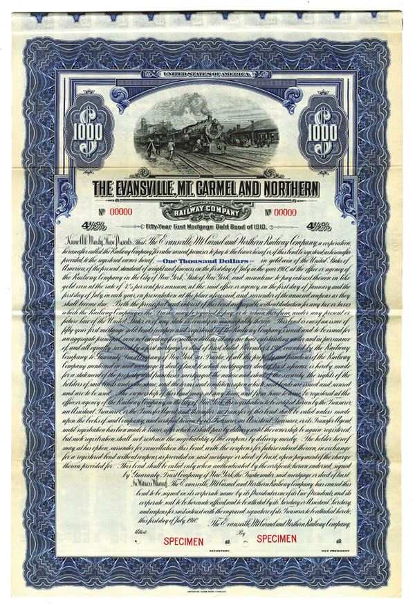 Illinois. $1000 Specimen 4 1/2% 1st Mortgage Gold Coupon Bond, Black print on large blue border and under tint, Image of locomotive at station with workers at tracks, Specimen overprints, POC's, VF-XF condition, ABNC. Listed Railroad on Cox, but Unlisted Bond Type.