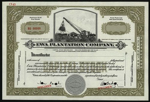 Hawaii, ND, Specimen Stock, 100 Shares, Black on olive border and underprint, Vignette of sugar cane farming top center, POC's and red SPECIMEN overprints, VF-XF condition, WBNC.
