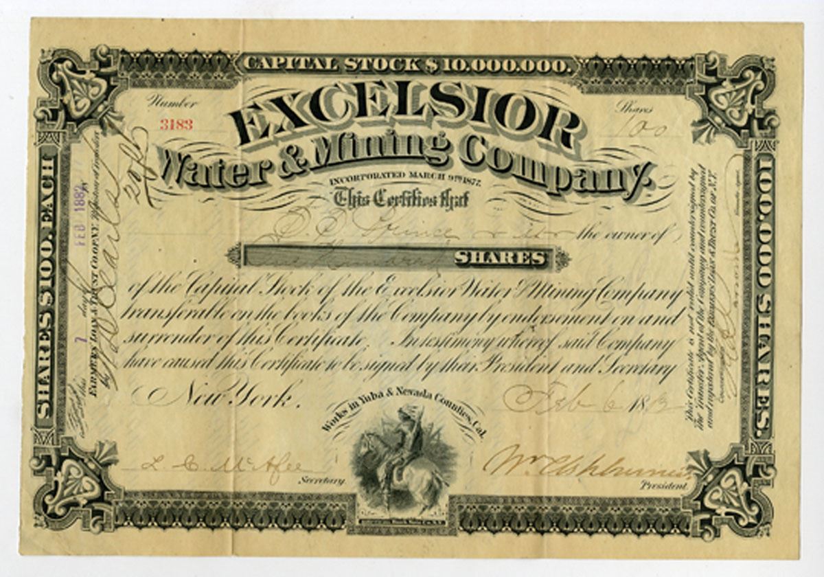 Yuba & Nevada Counties, California, 1883. 100 Shares Capital Stock I/U Certificate, Black on black border with company title at top and small vignette of Native man on horseback at bottom, S/N 3183, Incorporated in California with mines located in Yuba & Nevada Counties, VF-XF condition, ABNC.