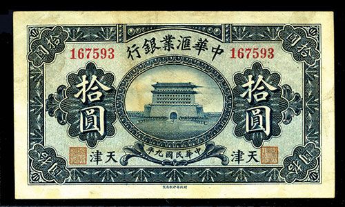 China, 1920, $10, P-S306r, S/M#C256-3b, Remainder banknote, No Signatures on back, PMG graded About Uncirculated 53, attractive and well centered note.