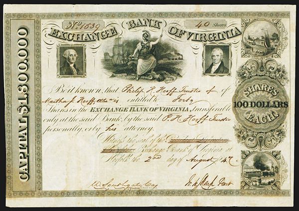 Norfolk, Virginia, 1847, 40 Shares, #1539, I/U stock certificate, Black with no underprint with Allegorical Liberty flanked by Portraits, Sail boat & Barge top right corner and Locomotive L/R bottom right vignettes, Fine condition with light toning.