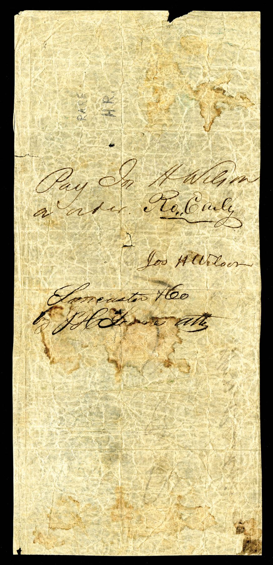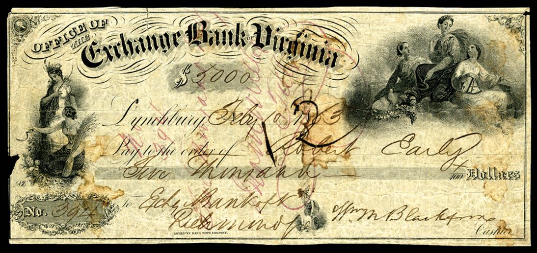Lynchburg, Virginia, 1863, $5000 I/C draft or check made out to Robert Early and signed by cashier William Blackfine, Draft payable at Exchange Bank of Richmond. Native American woman with female reaper and sheaves at left, 3 seated allegorical women at right, VG to Fine condition, stains, edge tears, and small piece missing left border. Interesting late use of an ABN printed draft by the Confederacy. Allegorical women on upper right and Native American woman and reaper at left, Check # 394, ABNC.