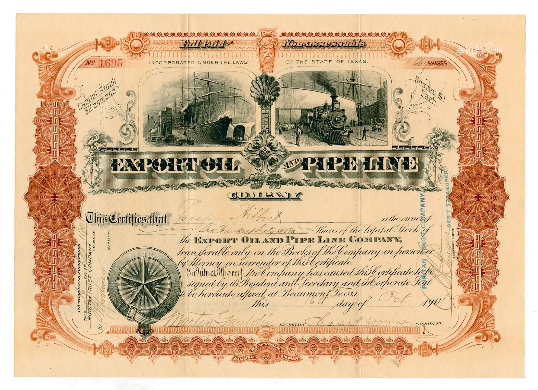 Texas. 667 shares, I/U Stock Certificate. Vignettes of locomotive and ship at top with ornate border. Black print on red-brown border. VF. NYBNC.