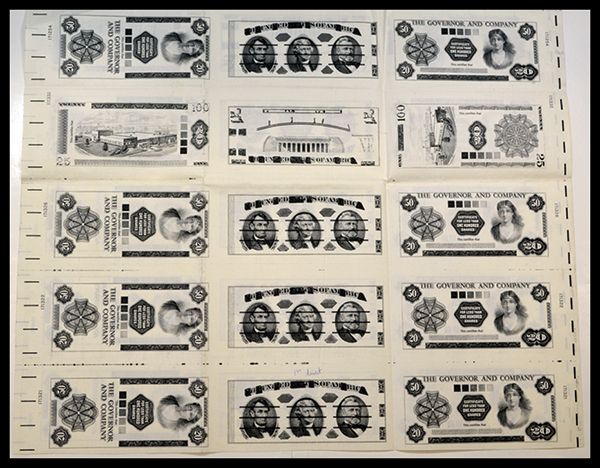 Extraordinary 15-Subject Giori Test Sheet. 1970. 21” x 17,” black, three columns by five rows, printed on both sides. The sheet contains six different combinations of the following subjects: 1) “Jefferson” plate (Lincoln, Jefferson and Washington). 2) Lincoln Monument. 3) horizontal “THE GOVERNOR AND COMPANY” (relating to the Bank of Ireland). 4) similar vertical format “THE GOVERNOR AND COMPANY” (perhaps for use on the back panels of securities). 5) horizontal printing plant. 6) vertical printing plant. Types 3-6 have not been seen by this cataloger previously, and ten of the fifteen notes utilize these types. On the front of the sheet is a notation in pencil and pen that states “BA | BEP | HUCK 1970 / Different impression mats around the cylinders – 171282 backing 171254.” Almost Uncirculated. (If cut, the sheet should yield five AU notes, and 10 Crisp Uncirculated notes.)
