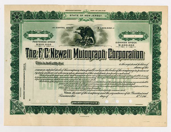 NJ. 190- (1900-1909). Specimen. Odd shs, green. Eagle and shield. A mutograph or mutoscope is a device for creating a moving picture from a series of still photographs. Both the kinetoscope and the mutograph required the viewer to peer into a viewing slot while turning a handle. But whereas Edison's device used a strip of film, Casler's was very close in idea to the flip-book, in which riffling through a sequence of still pictures seems to create a moving image. In the mutoscope the pictures were arranged around a drum; turning a handle caused them to appear one after the other at about 16 frames a second, the minimum needed to give an illusion of movement. The big problem with both the kinetoscope and the mutograph was that only one person could watch at a time. It was created by the American inventor Herman Casler and patented in 1894. Extremely rare pre-silent film era movie certificate. SBNC. XF. (Ex. John E. Herzog Collection)