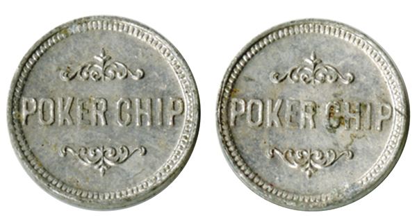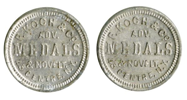 F. Koch & Co. Adv. Medals & Novelty 43 Centre St. NY. Poker Chip on reverse. 17mm white metal. Very Fine or better. 2 pieces.