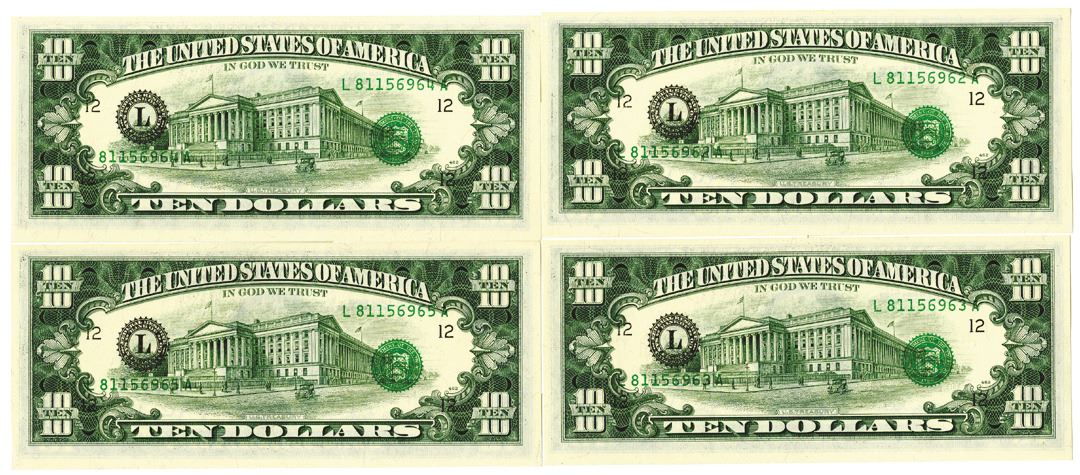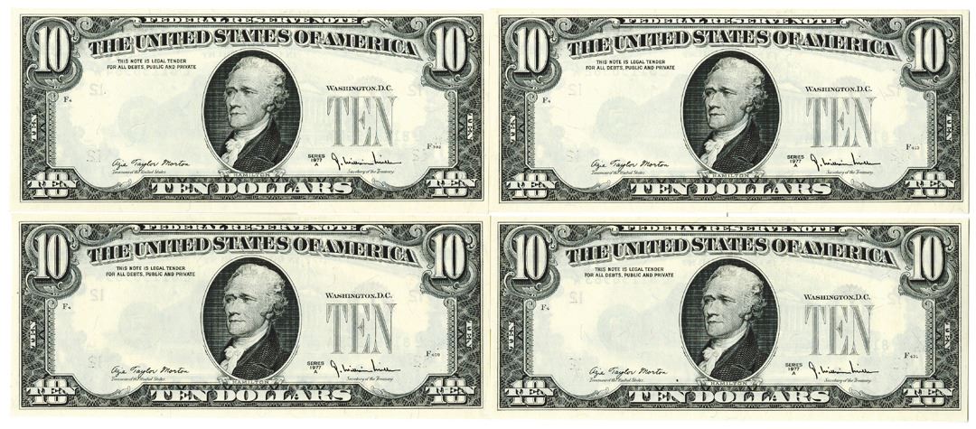 Washington, D.C., 1977. Amazing Consecutive quartet $10, Error, Serial #'s and seals on back of note, Unc. $10 of 1977 A, Group of 4 consecutive $10 Uncirculated notes of 1977A series with the serial #'s and Seals missing from the front, third printing on reverse, Withæprinted signatures from George William Miller (Secretary) and Azie Taylor Morton (Treasurer). All are in CU to Gem Uncirculated. (4)