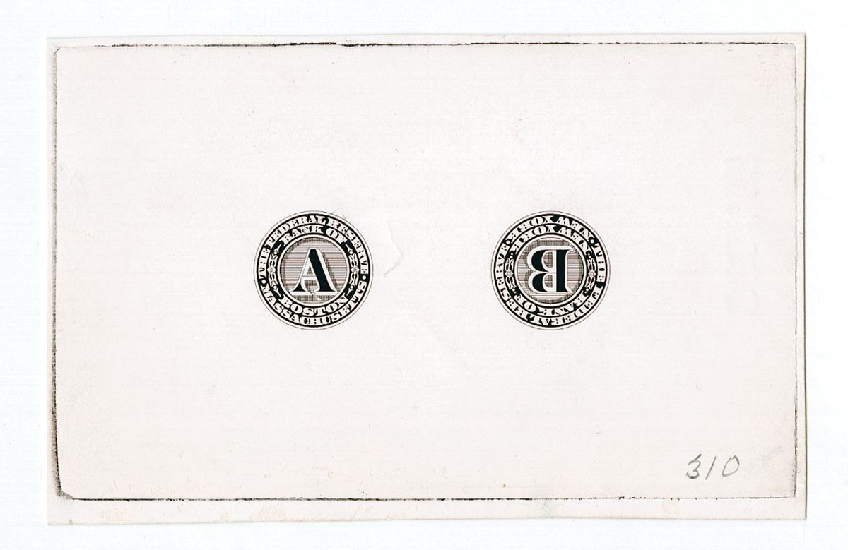 Washington, D.C., Federal Reserve District Seal Proof Vignette seals for District " "A", Boston, Massachusetts,, and District "B", New York, NY. Both Vignette seals are intaglio printed in black on thin white glossy card with the back overprinted "577093", "ENGRAVER'S STOCK PROOF AUTHORIZED BY ______", These were used on U.S. Federal Reserve currency, Uncirculated condition, BEP.