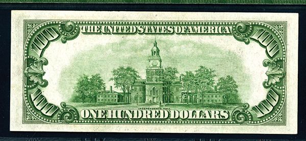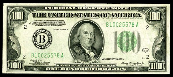 F.R.N., New York, $100, 1934A, Fr.#2153-Bm Mule (BA Block). New York, NY. Julian | Morgan signatures, S/N B10025578A, pp J. bp 89. PMG graded Choice Uncirculated 64.