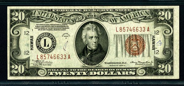 F.R.N. WWII Emergency Issue, $20, 1934A, Fr#2305, (LA Block). San Francisco, CA. Julian | Morgenthau signatures, S/N L85746633A, pp I. PMG graded Extremely Fine 40. "ANNOTATIONS." (Lightly penned numerals on the front, hardly distracting.)