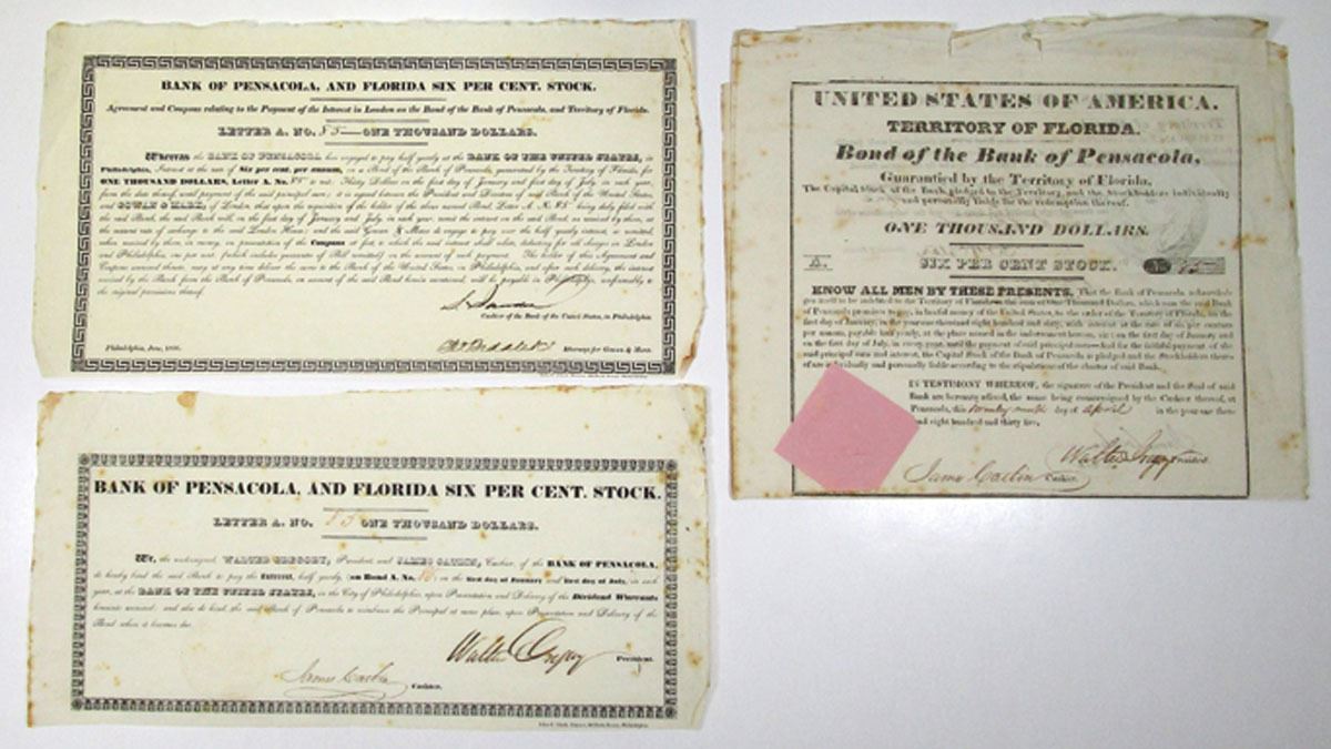 Pensacola, Florida, 1835-36. Lot of 3 I/U Stocks and Bonds, Includes: 6% Stock Cert., 1836 and $1000 6% Bond. Documents range from Fine to VF condition. (3). Sold "AS IS" no returns accepted.