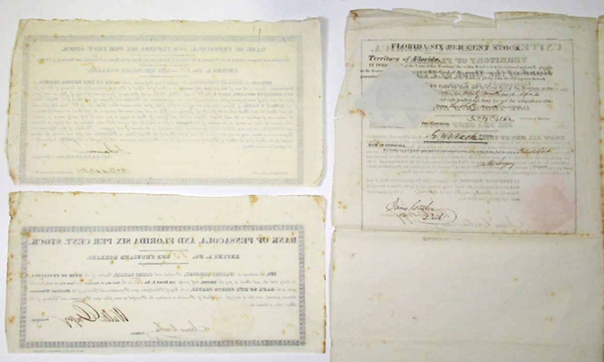Pensacola, Florida, 1835-36. Lot of 3 I/U Stocks and Bonds, Includes: 6% Stock Cert., 1836 and $1000 6% Bond. Documents range from Fine to VF condition. (3). Sold "AS IS" no returns accepted.