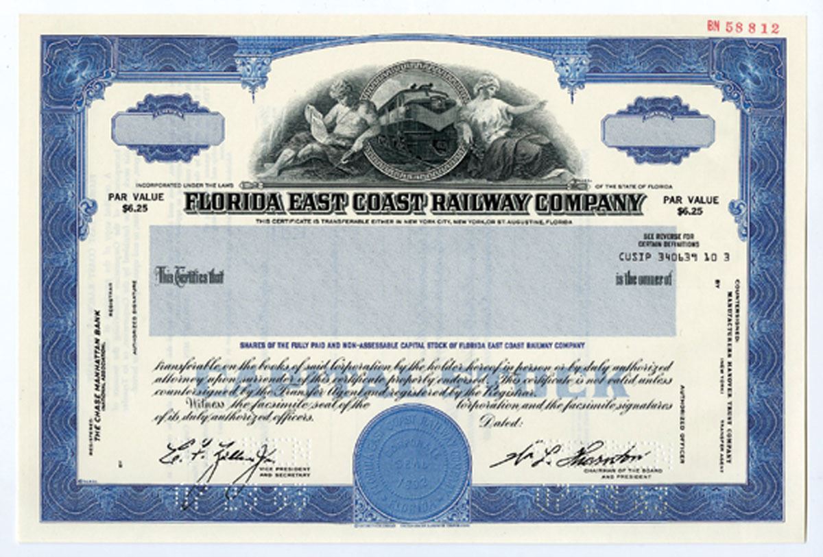 Florida East Coast Railway Co., 1983 Odd Shrs Specimen Stock Cert., XF SC-USBN. The Florida East Coast Railway is a Class II railroad operating in the U.S. state of Florida, currently owned by Grupo México. Built primarily in the last quarter of the 19th century and the first decade of the 20th century, the FEC was a project of Standard Oil principal Henry Flagler. He originally visited Florida with his first wife, Mary; they sought assistance with the health issues she faced. A key strategist who worked closely with John D. Rockefeller building the Standard Oil Trust, Flagler noted both great potential and a lack of services during his stay at St. Augustine. He subsequently began what amounted to his second career, developing resorts, industries, and communities all along Florida's shores abutting the Atlantic Ocean.