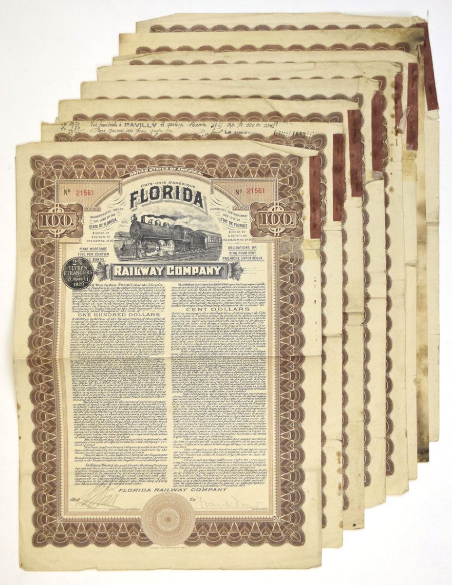 Florida, 1909. Lot of 8 $100 I/U 5% First Mortgage Coupon Bonds, Black print with brown border, Locomotive vignette at center, Certificate is printed in English and French, French revenue stamp at top left corner, Condition ranges from Good to Fine. SBNC. (8). Sold "AS IS" no returns accepted.