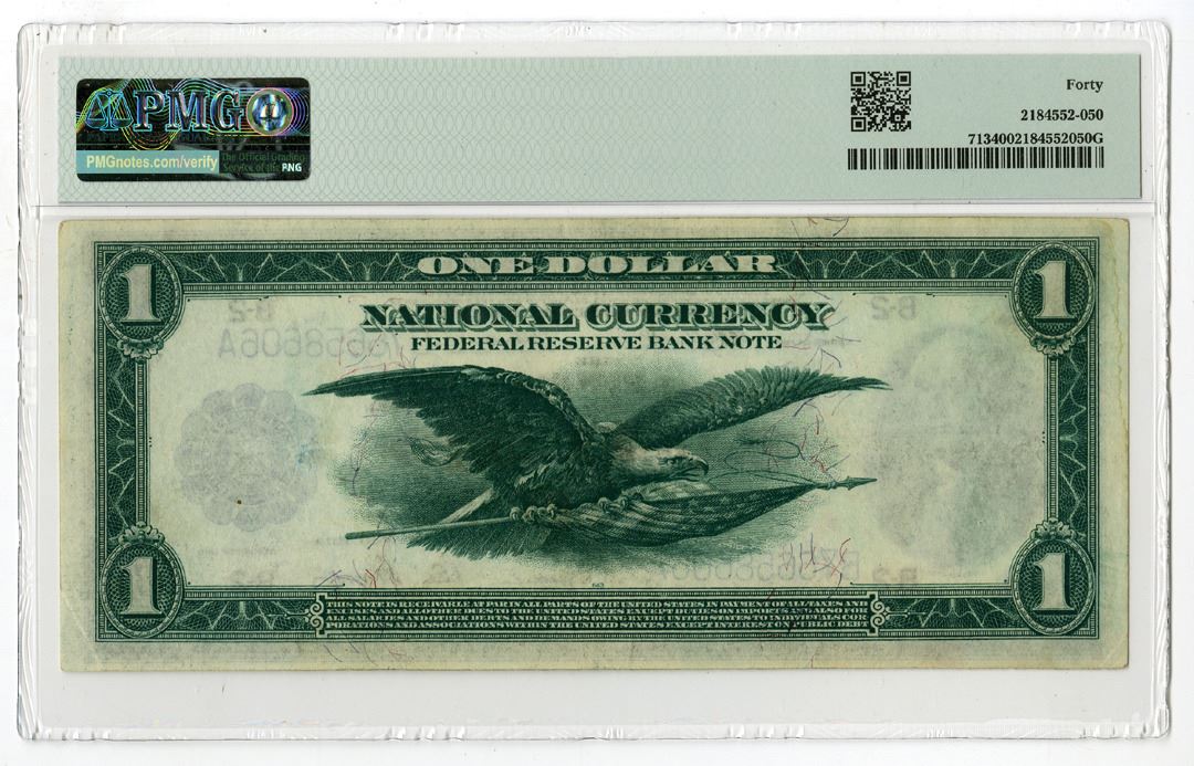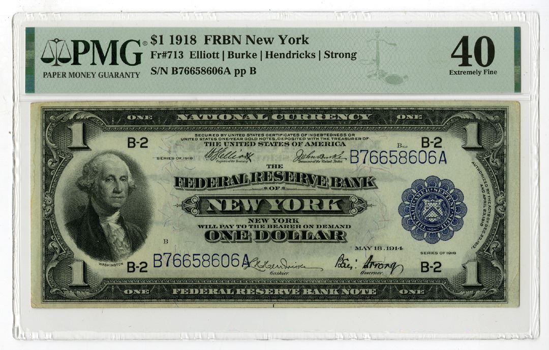 FRBN, New York, $1 Fr# 713 1918 Elliott Burke Hendricks | Strong Signatures, S/N B76658606A, PMG graded Extremely Fine 40