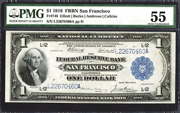 CA. $1, 1918, Elliot | Burke | Ambrose | Calkins, S/N L22670460A pp D, PMG graded About Uncirculated 55 but note appears CU.