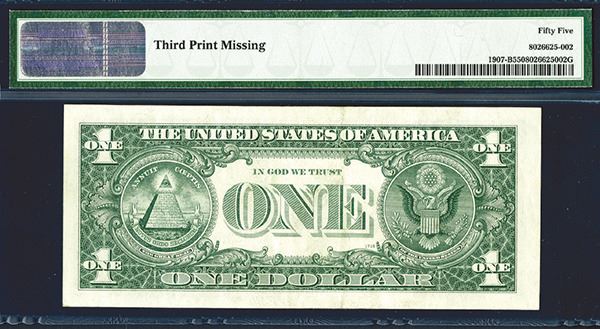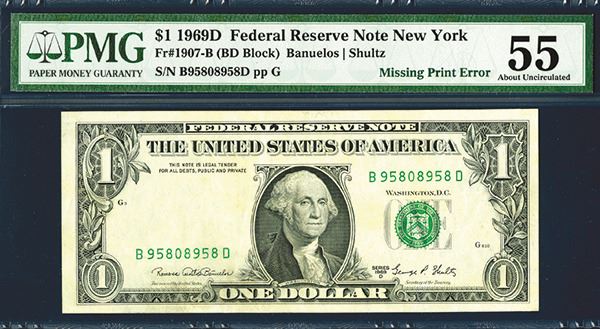 U.S., Error, S/N B95808958D pp G, PMG graded AU 55, Attractive note and scarce error.