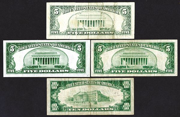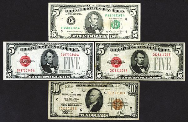Federal Reserve Note $5. 1981A Front and back fold error; US Notes $5. 1928A, 1928C; National Philadelphia Federal Reserve. 1929.Very Fine or better. 4 pieces.