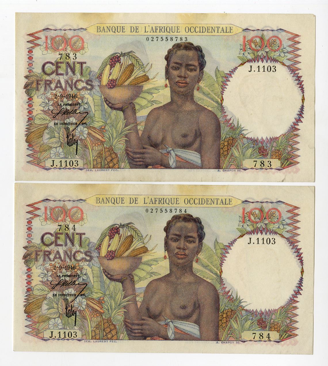 French West Africa...., 1946. Lot of 2 sequential 100 Francs, P-40 (2), Issued Banknotes, Multicolor printing with bare breasted woman holding bowl of fruit and vegetables, Back is m/c with family at center, S/Ns J.1103 783 & J.1103 784, one has a vertical fold and the second has a small 3mm tear on the top right margin away from the design, both with signs of handling and appear Choice VF to AU. (2). Sold "AS IS" no returns accepted.