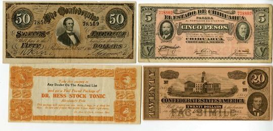 New York, Texas, Ohio. Lot of 4 notes. 2 are Facsimile C.S.A. Advertising notes, Includes: one is Dr. Hess Stock Tonic; and Estado de Chihuahua. VF to Unc. (4)