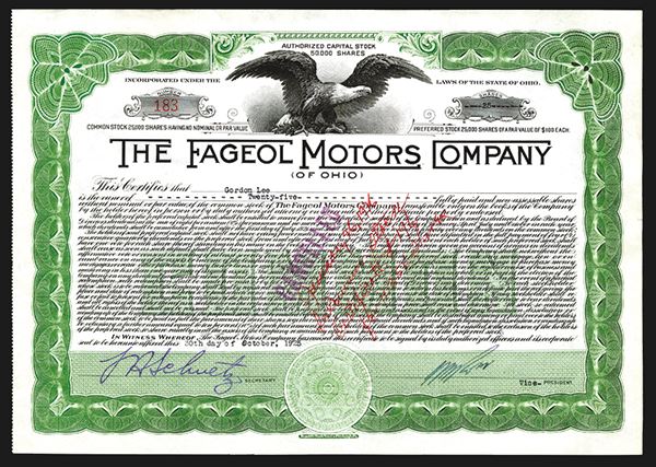 Ohio, 25 Shares, I/C, Eagle on top, Green border and undertint, S/N 183, VF. Scarce auto certificate. RBNC.