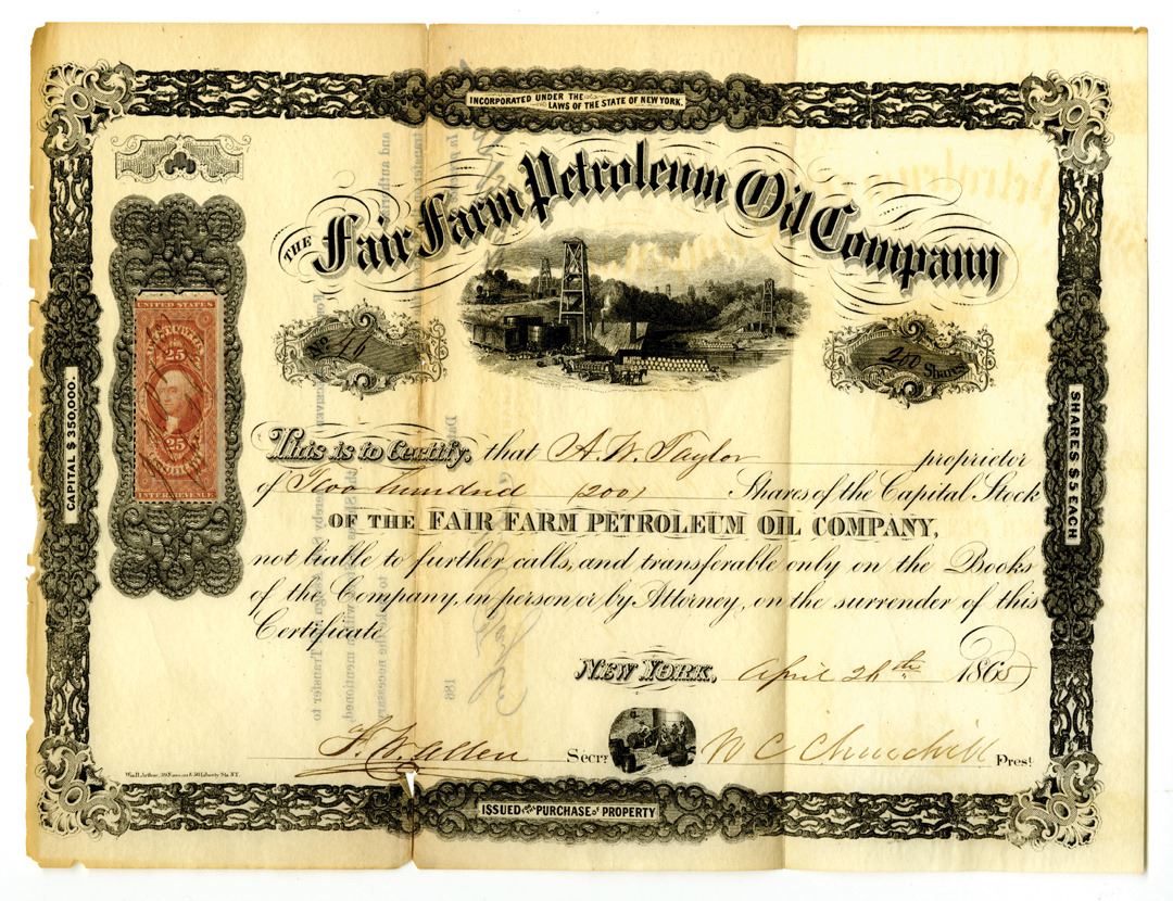 New York. 200 Shares I/U Stock Certificate. Black printing with an ornate black border. Vignette of a oil farm at top center and a small Vignette of men closing barrels at the bottom. Low certificate #46. 25 cent adhesive revenue stamp at left side. VF condition with minor edge chips at left margin.