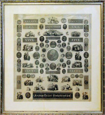ca.1820's-30's. 16 by 17.5 inch framed and matted advertising vignette sheet for FDU with 3 inch diameter George Washington medallion vignette in middle flanked by multiple cameo vignettes, allegorical vignettes, denomination counterfoils, counterfoils with cameo portraits, animal vignettes and miscellaneous vignettes. Fine appearance with toning spots on bottom margin and small tears on upper right corner, but a small 1 inch triangular piece is missing from the right middle border that does not detract from appearance. I am not certain how it is mounted or attached to the matting. Rare early advertising security printer vignette sheet. FDU.