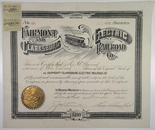 Wheeling, West Virginia, 100 Shares, I/U Stock certificate, Black without underprint, Electric streetcar on top middle, Gold foil seal lower left, S/N 99, 2 U.S. Revenue stamps on upper left, VF condition with 6 pin holes on top middle margin. Rare and attractive WV railroad. This is the only variety of certificate known on this railroad.