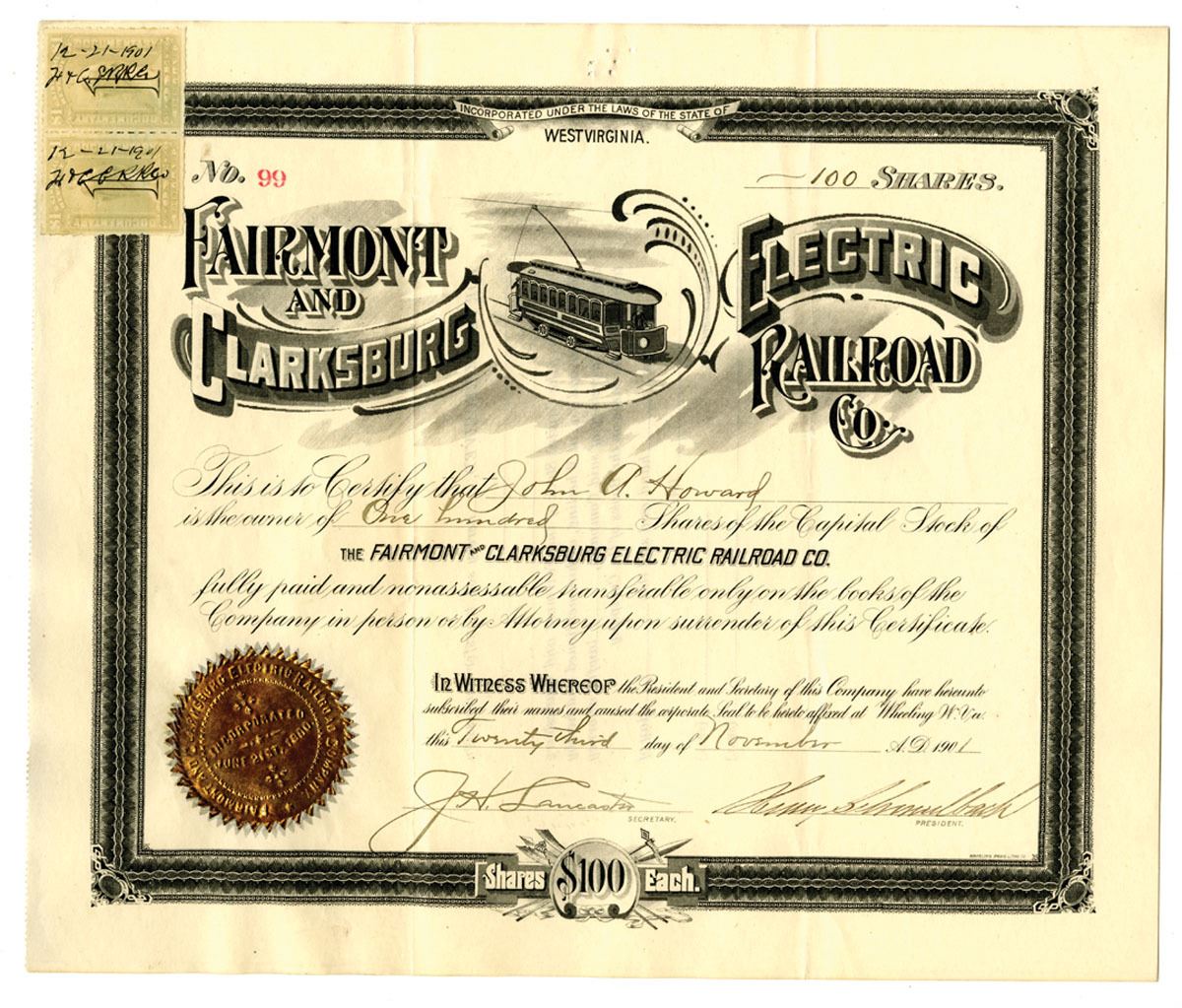 Wheeling, West Virginia, 100 Shares, I/U Stock certificate, Black without underprint, Electric streetcar on top middle, Gold foil seal lower left, S/N 99, 2 U.S. Revenue stamps on upper left, VF condition with 6 pin holes on top middle margin. Rare and attractive WV railroad. This is the only variety of certificate known on this railroad.
