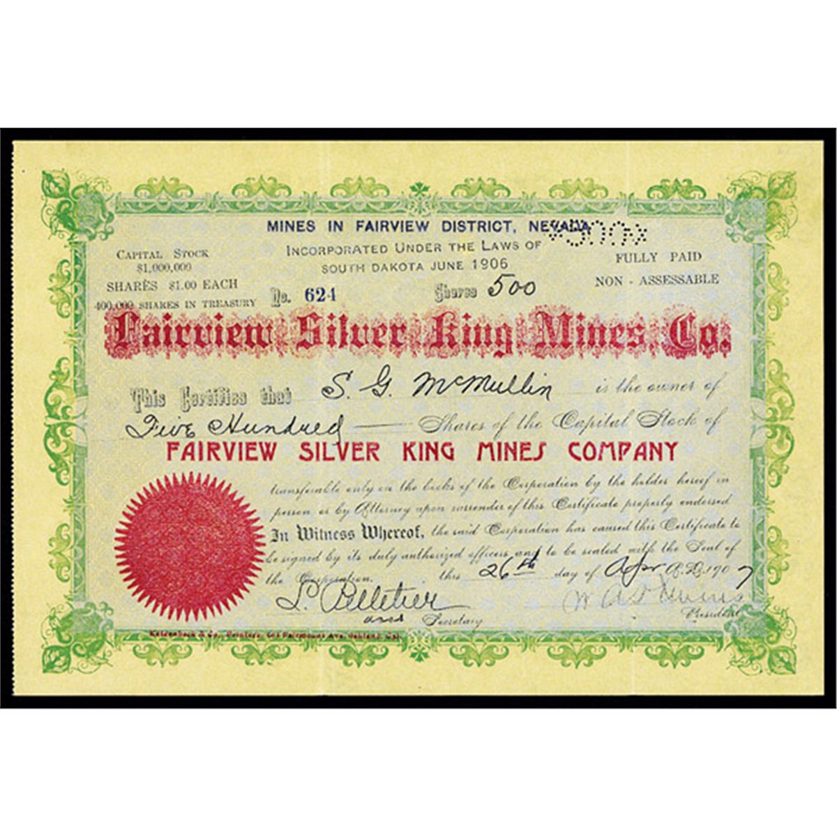 Nevada, 1907, 500 Shs., Issued Stk., Green, and Red Lettering with Silver Background, VF. Mines in Fairview District, Nevada.