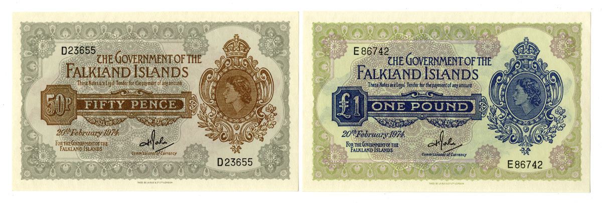 Falkland Islands...., 1974. Lot of 2 Issued Banknotes, Includes: 1 Pound, P-8b, Blue on gray-green and lilac underprint with portrait of Queen Elizabeth II at right; 50 Pence, P-10b, Brown on gray underprint with portrait of Queen Elizabeth II at right. Notes are in Choice AU to Uncirculated condition. TDLR. (2). Sold "AS IS" no returns accepted.
