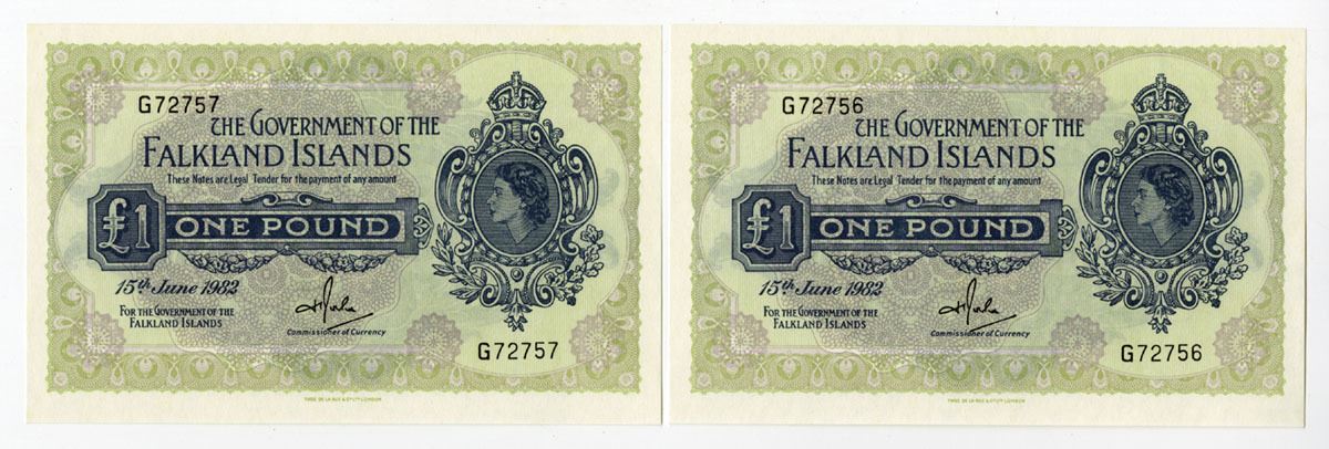 Falkland Islands....., 1982. 1 Pound, P-8e (2), Sequential Pair of Issued Banknotes, Blue on gray-green and lilac underprint with portrait of Queen Elizabeth II at right, Back blue with kaleidoscopic pattern at center, S/Ns G72756 & G72757, Notes are in Choice AU to Uncirculated condition. TDLR. (2). Sold "AS IS" no returns accepted.