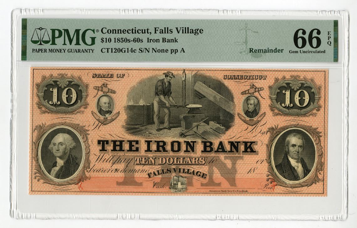 Falls Village, Connecticut, 1850-60s. $10, CT-120-G14c, Remainder Banknote, Black print on red underprint, Foundry at top center with Washington at bottom left and Portrait of another gentleman at bottom right, Uniface note, S/N None pp A, PMG graded Gem Uncirculated 66 EPQ.