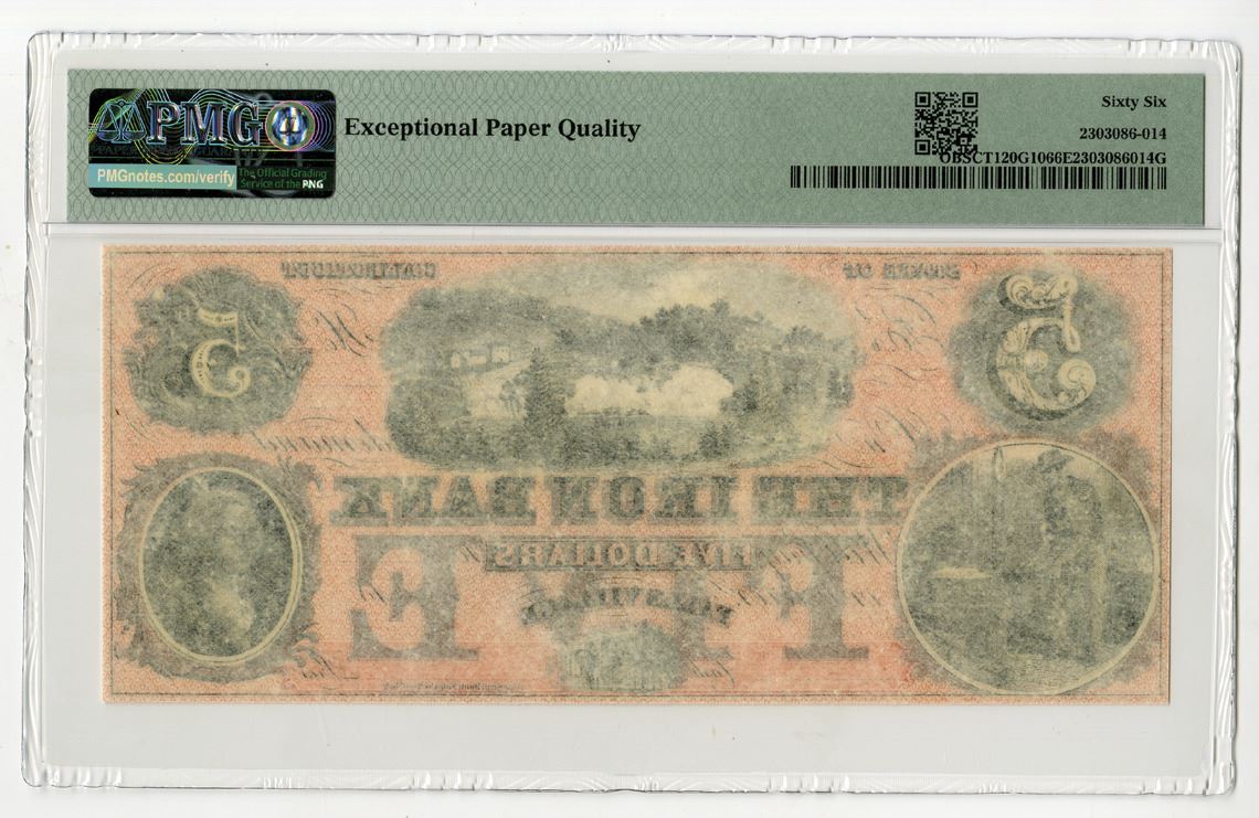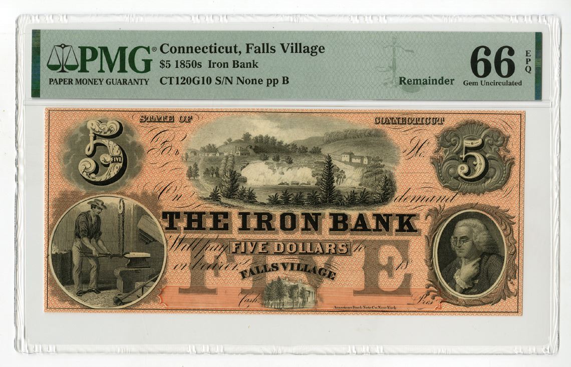 Falls Village, Connecticut, 1850s. $5, CT-120-G10, Remainder Banknote, Black print on red underprint, Image of Falls at top with foundry at bottom left and Benjamin Franklin at right, Uniface note, S/N None pp B, PMG graded Gem Uncirculated 66 EPQ.