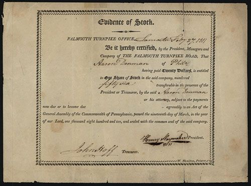 Pennsylvania, 1811, I/U, 1 Share, #56, Black ornate border with no vignette, VG condition with vertical tape repair on right side, W. Hamilton Printers.