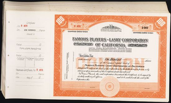 California, 19xx (ca.1920 - 1930), 100 Shs., Unissued Stock, Orange border with theatrical masks vignette, XF condition, SBNC.