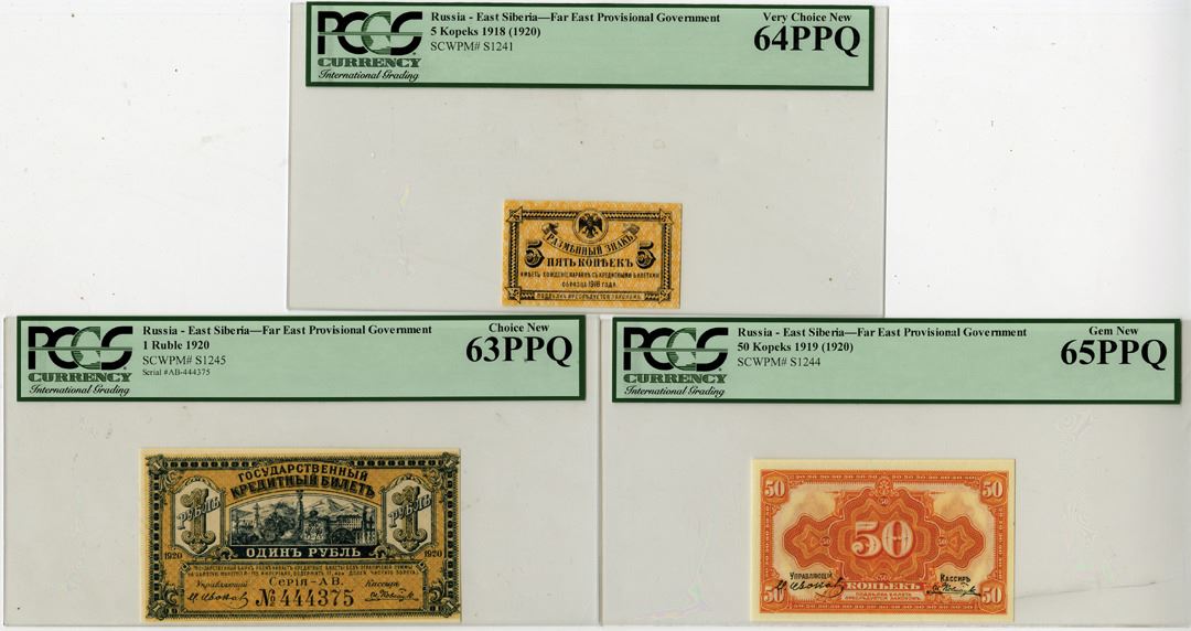 Russia - East Siberia, 1918 (1920). 3 Issued banknotes: 5 Kopeks, P-S1241, black on orange underprint, PCGS graded Very Choice New 64 PPQ; 50 Kopeks, P-S1244, Orange, PCGS graded Gem New 65 PPQ; 1 Ruble, P-S1245, Black on off-yellow underprint, S/N AB-444375, PCGS graded Choice New 63 PPQ. (3)