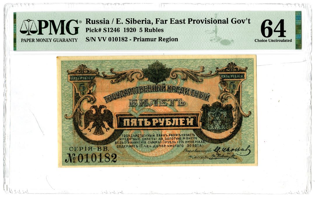 Russia/East Siberia. 1920. 5 Rubles, P-S1246, Issued banknote, Black on green and pink underprint, S/N VV 010182 - Priamur Region, PMG graded Choice Uncirculated 64. Only 2 notes grade higher out of 16 notes graded in the PMG census. This is the only uncirculated example of this attractive note to be offered at auction in the last 5 years. Only 16 notes graded in the PMG census with only 8 notes in uncirculated condition.