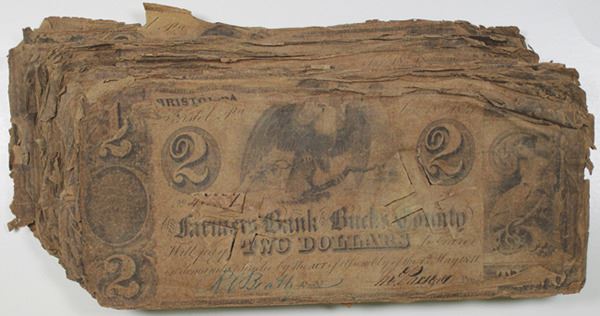 Bristol, Pennsylvania, 1841. Approximately 170 to 230 Obsolete Banknotes, All are $1 and $2 Issued and Cancelled bills from Farmers Bank of Bucks County. Poor to Good condition with significant damage and wear due to cancellation with notes mostly able to be separated with extra care. All are toned and have cut cancels. (Approx. 170 to 230 notes)