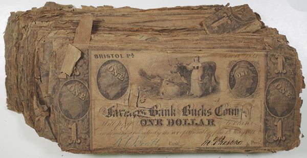 Bristol, Pennsylvania, 1841. Approximately 140 to 200 Obsolete Banknotes, All are $1 and $2 Issued and Cancelled bills from Farmers Bank of Bucks County. Poor to Good condition with significant damage and wear due to cancellation with notes mostly able to be separated with extra care. All are toned and have cut cancels. (Approx. 140 to 200 notes)