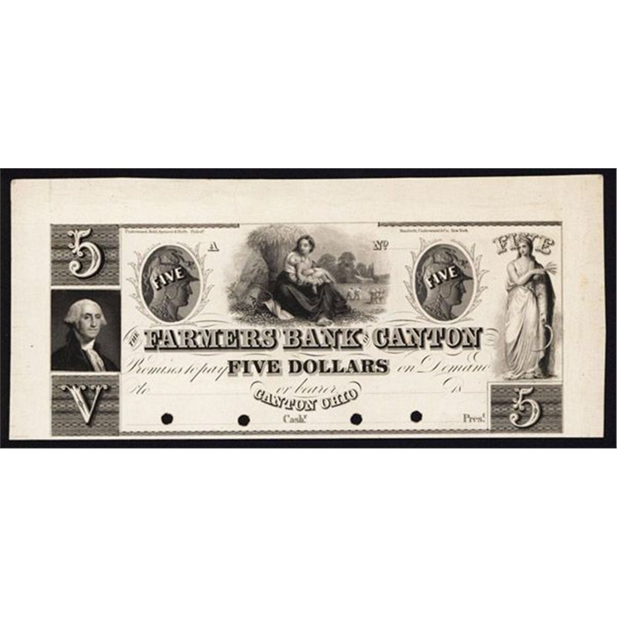 Canton, Ohio, 18xx (ca.1830's), $5, Plate A, OH-20-G42, Proof banknote, black on india paper on thin white card, Portrait of Washington on left, Standing allegorical reaper on right with cameo helmeted soldier's profiles flanking mother with baby by wheat with farmers in background, POC's, Choice to Gem Uncirculated condition with jumbo top and side margins, Underwood, Bald, Spencer & Hufty, Philad - Danforth, Underwood & Co. New York imprint. (Silver City Collection, Part 2)